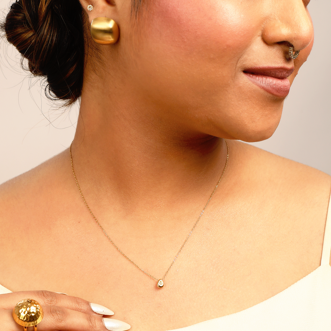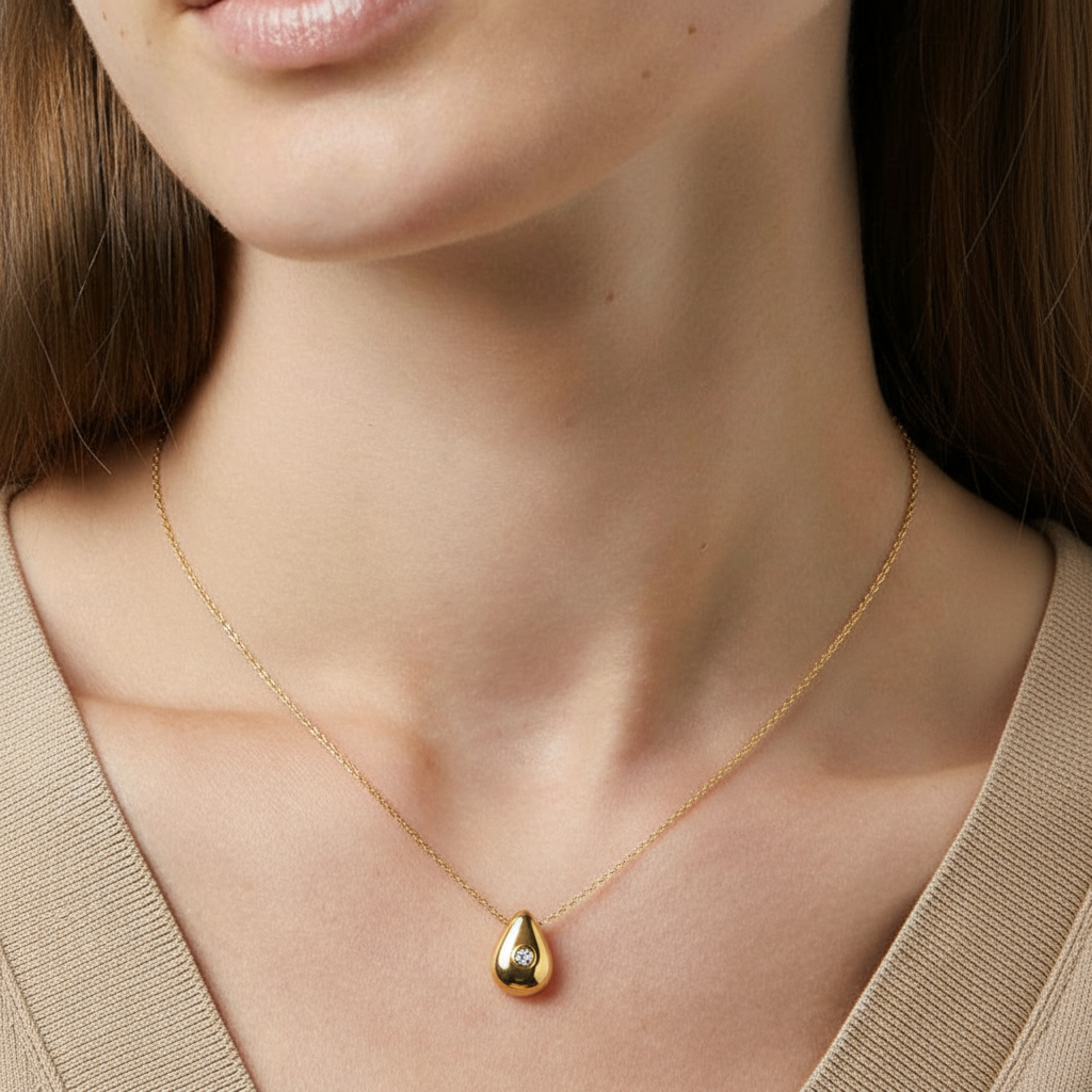 Capture effortless elegance with this minimal waterdrop pendant. Perfect for daily wear, it’s completely waterproof, hypoallergenic, and skin-safe, with a lasting 18K PVD plating that shines through gym sessions and showers.