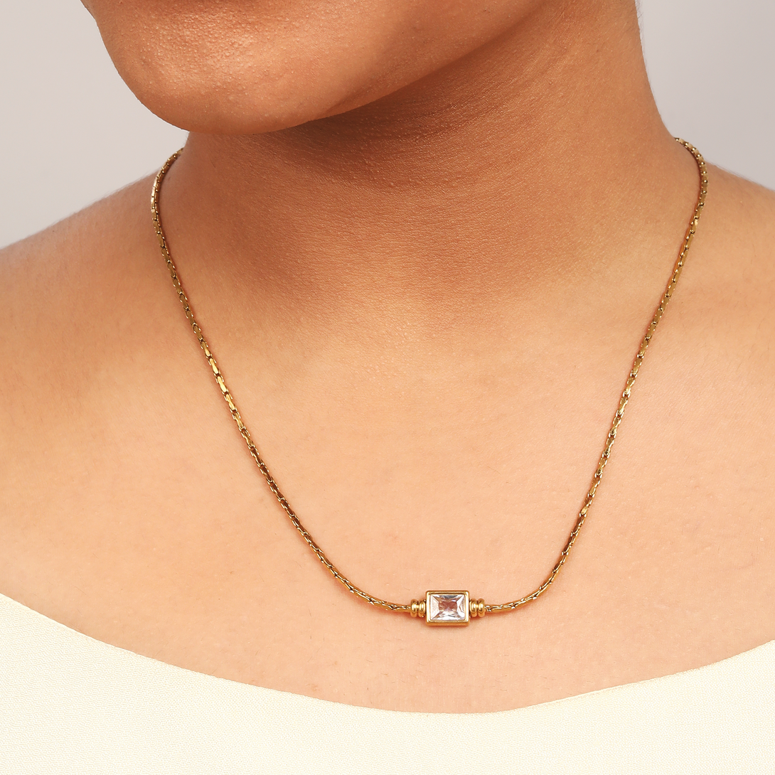 Go bold with this chunky chain featuring a brilliant Zircon stone. Perfect for adding sparkle, it’s also 100% waterproof, hypoallergenic, and skin-safe. The robust 18K PVD plating guarantees a lasting, tarnish-proof shine you can live in.