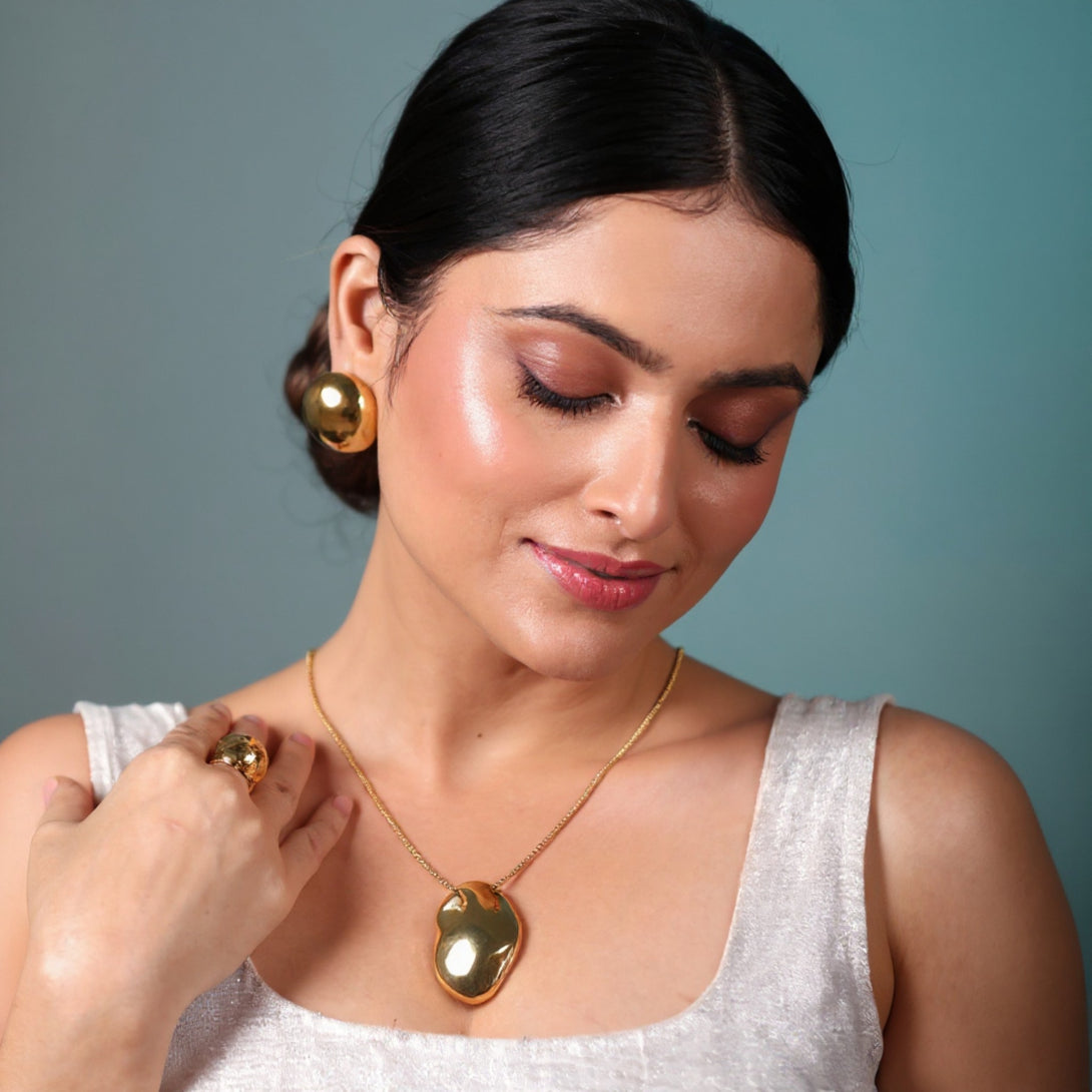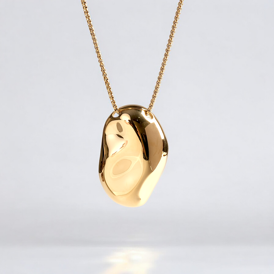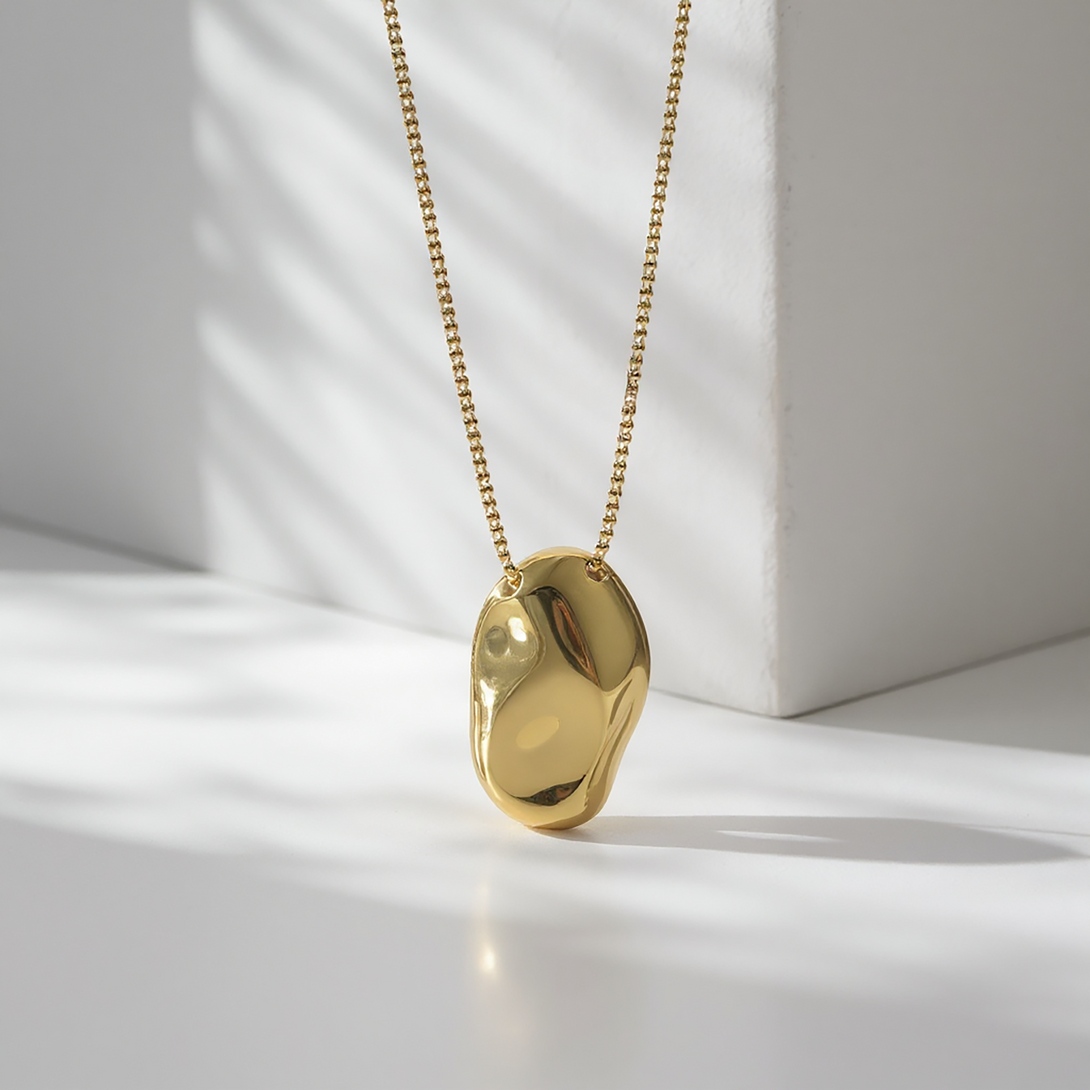 Flaunt a touch of modern artistry with this unique hammered pendant. Its organic shape is matched by incredible durability—it's waterproof, hypoallergenic, and skin-safe for continuous wear. The resilient 18K PVD plating protects its textured, handcrafted look.
