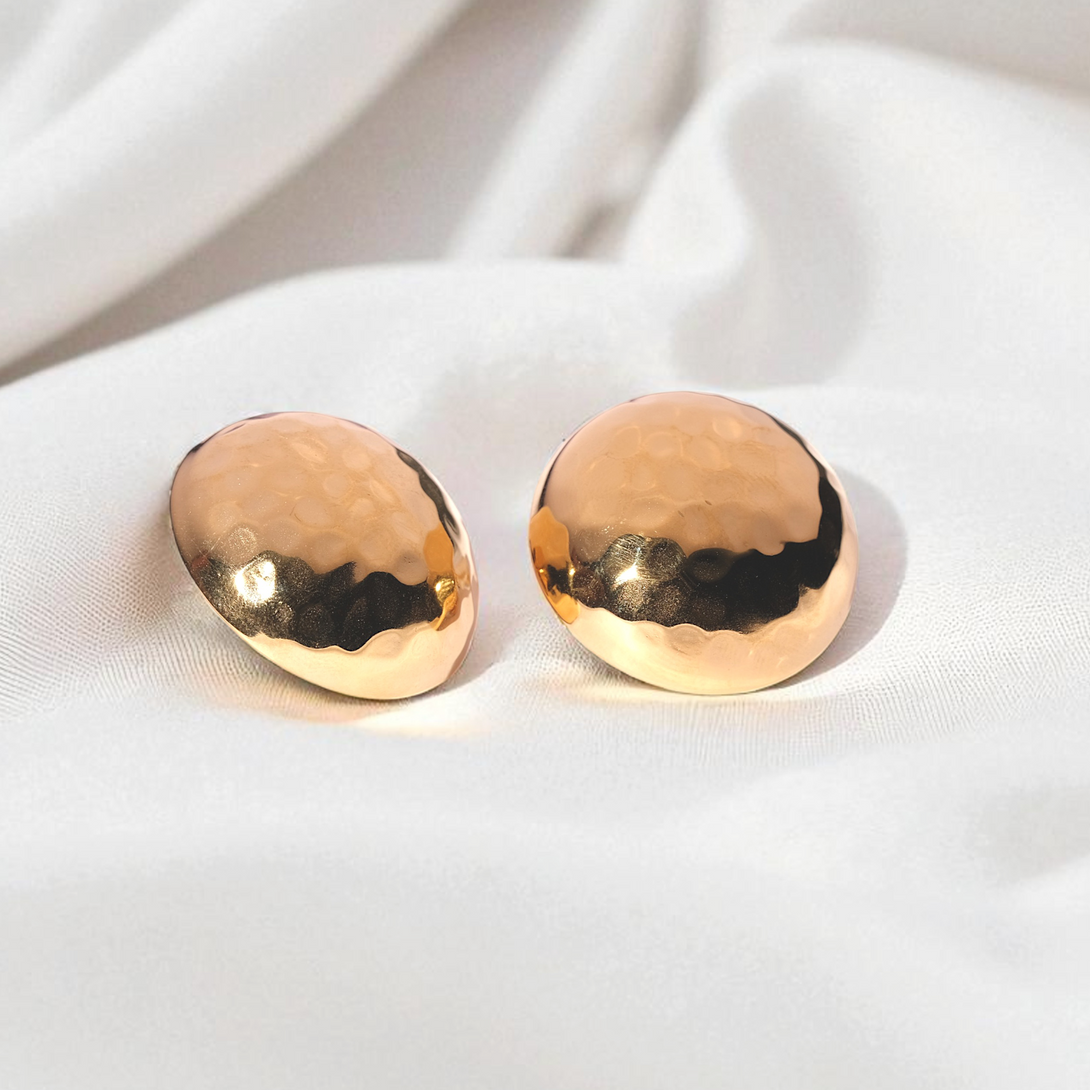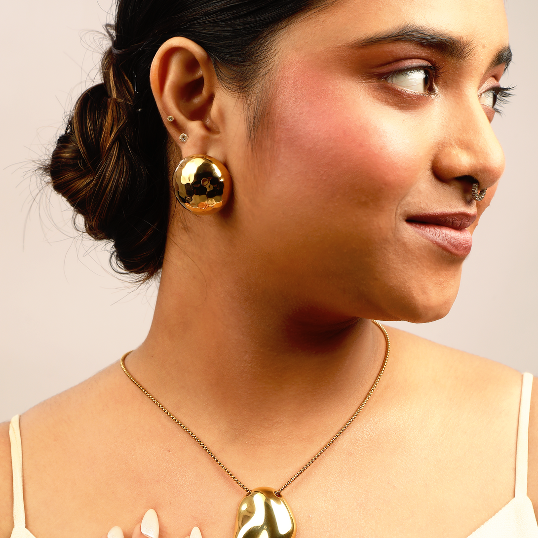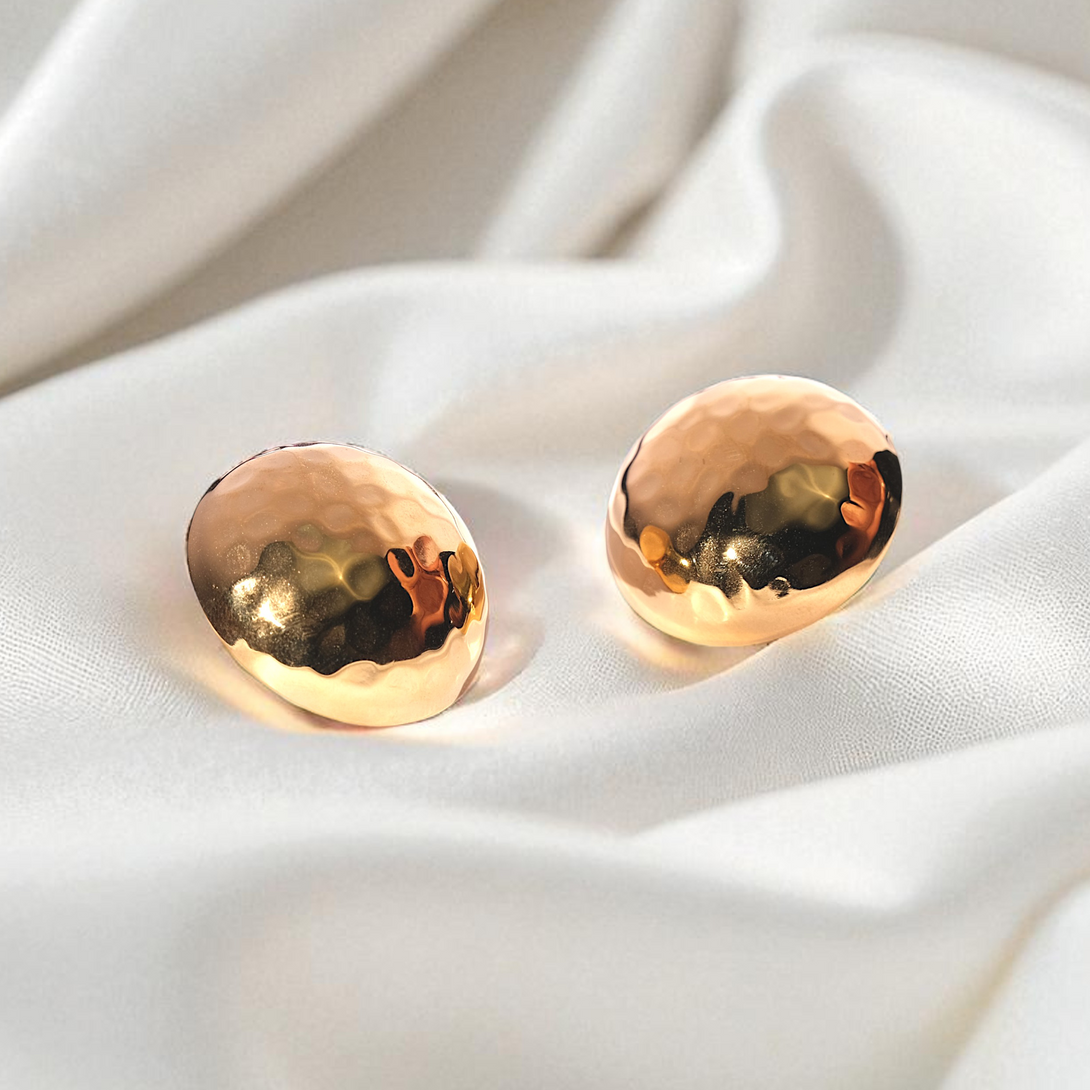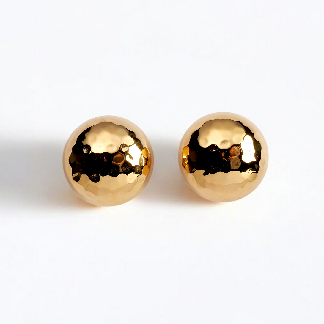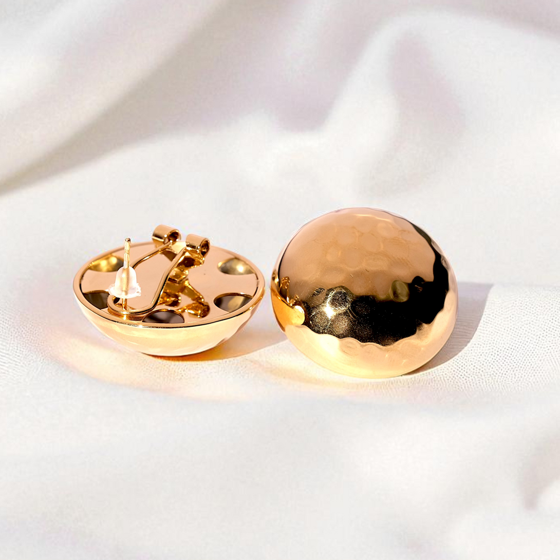 Make a bold statement with hollow, lightweight comfort. These hemispherical studs offer a chunky look without the weight. Designed for sensitive ears, they are skin-safe, waterproof, and hypoallergenic, with a lasting 18K PVD plating.