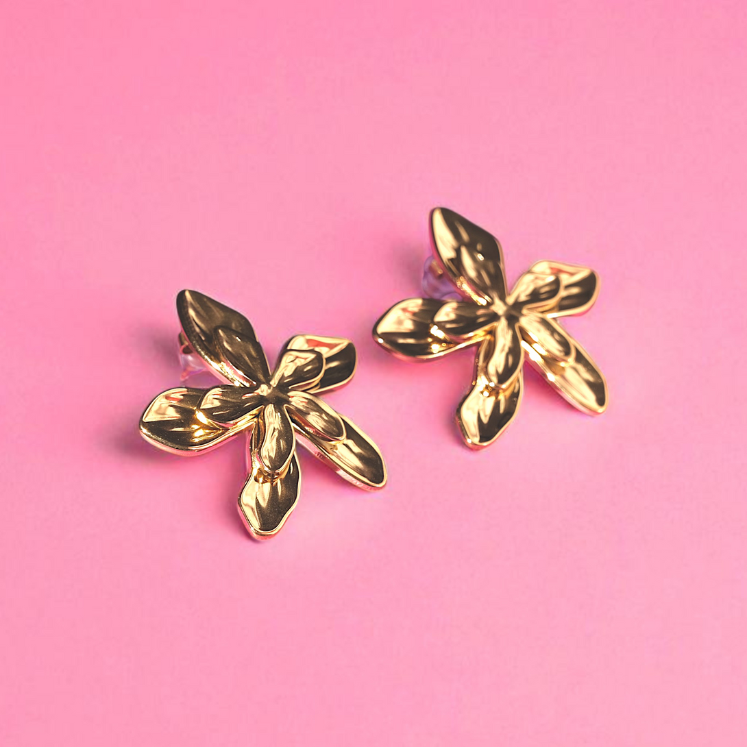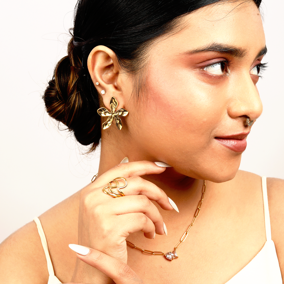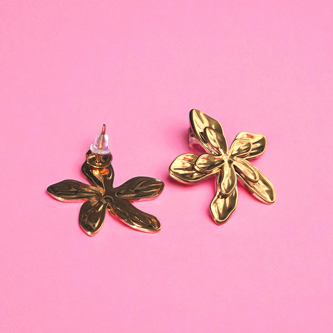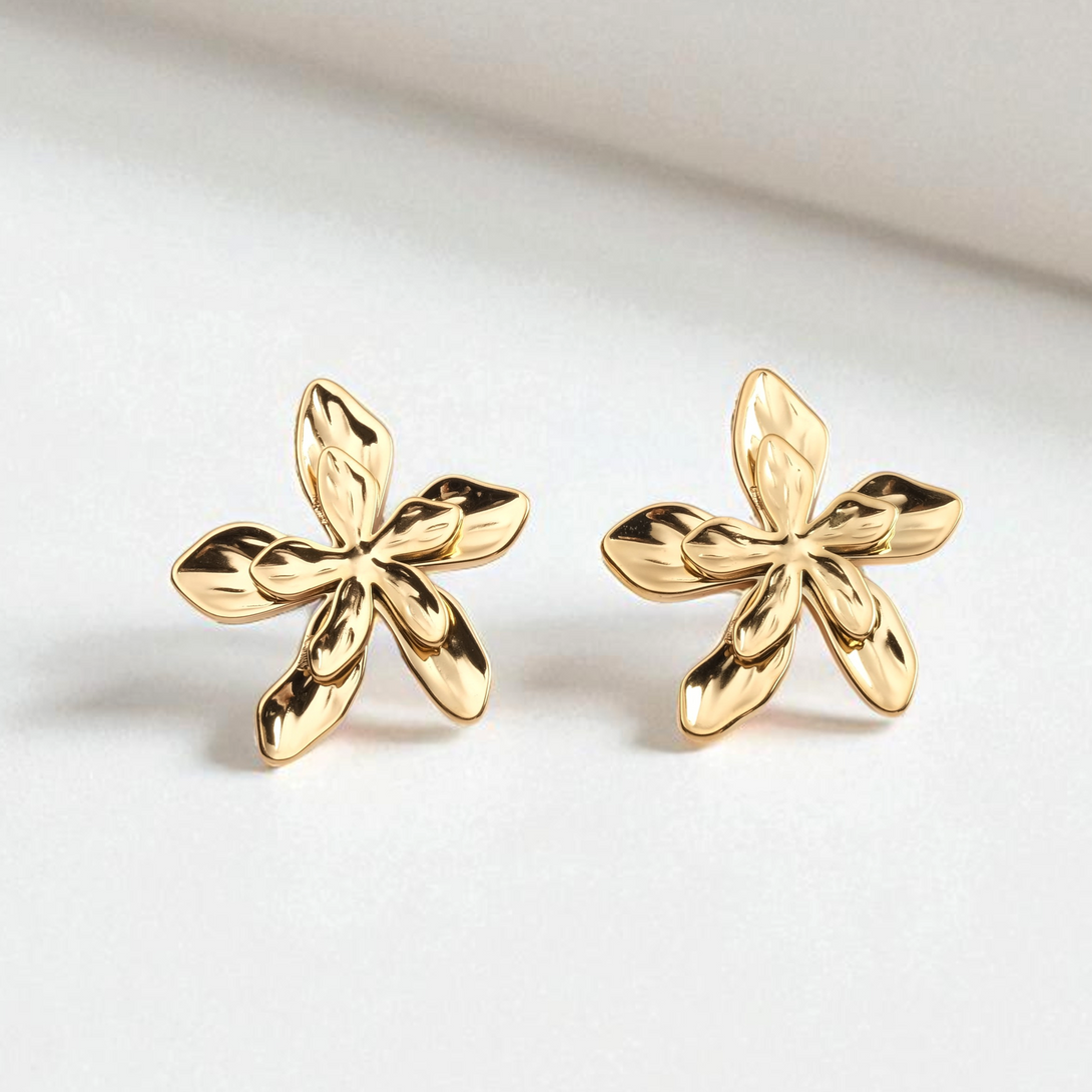 A touch of classic, floral vintage charm. These golden flower studs are a timeless accessory for any occasion. Designed for sensitive ears, they are waterproof, hypoallergenic, and skin-safe, with a resilient 18K PVD plating for an everlasting bloom.