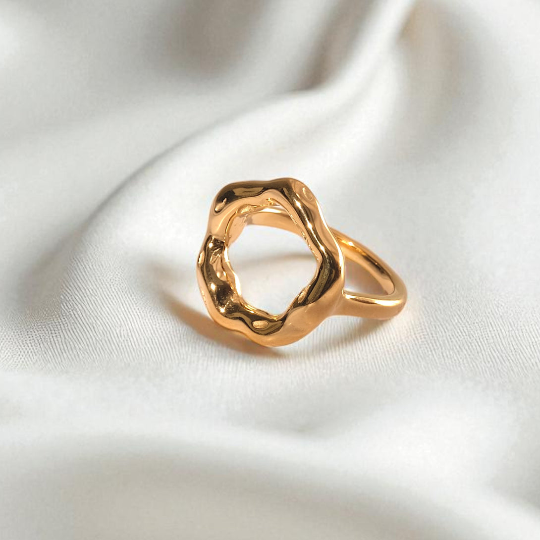 Embrace effortless artistry with this dainty, melted-texture ring. Designed for continuous wear, its waterproof and hypoallergenic 18K PVD plating ensures the unique, skin-safe finish won't tarnish or fade through daily tasks and workouts.