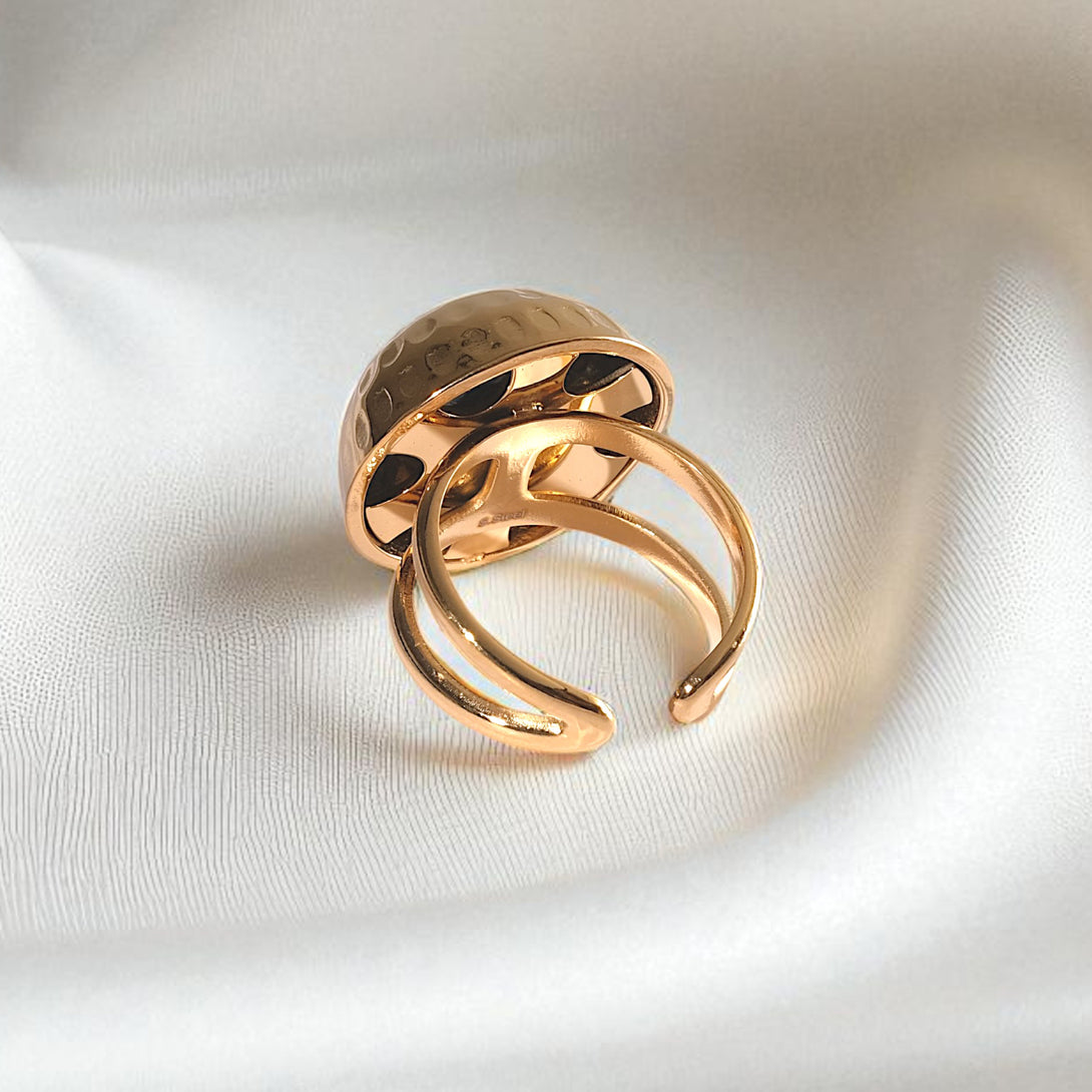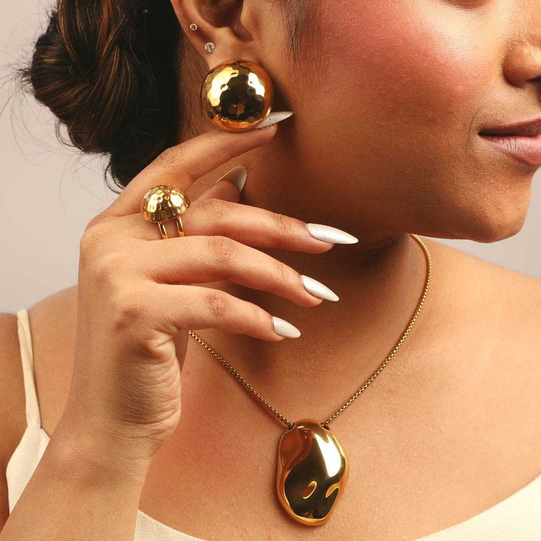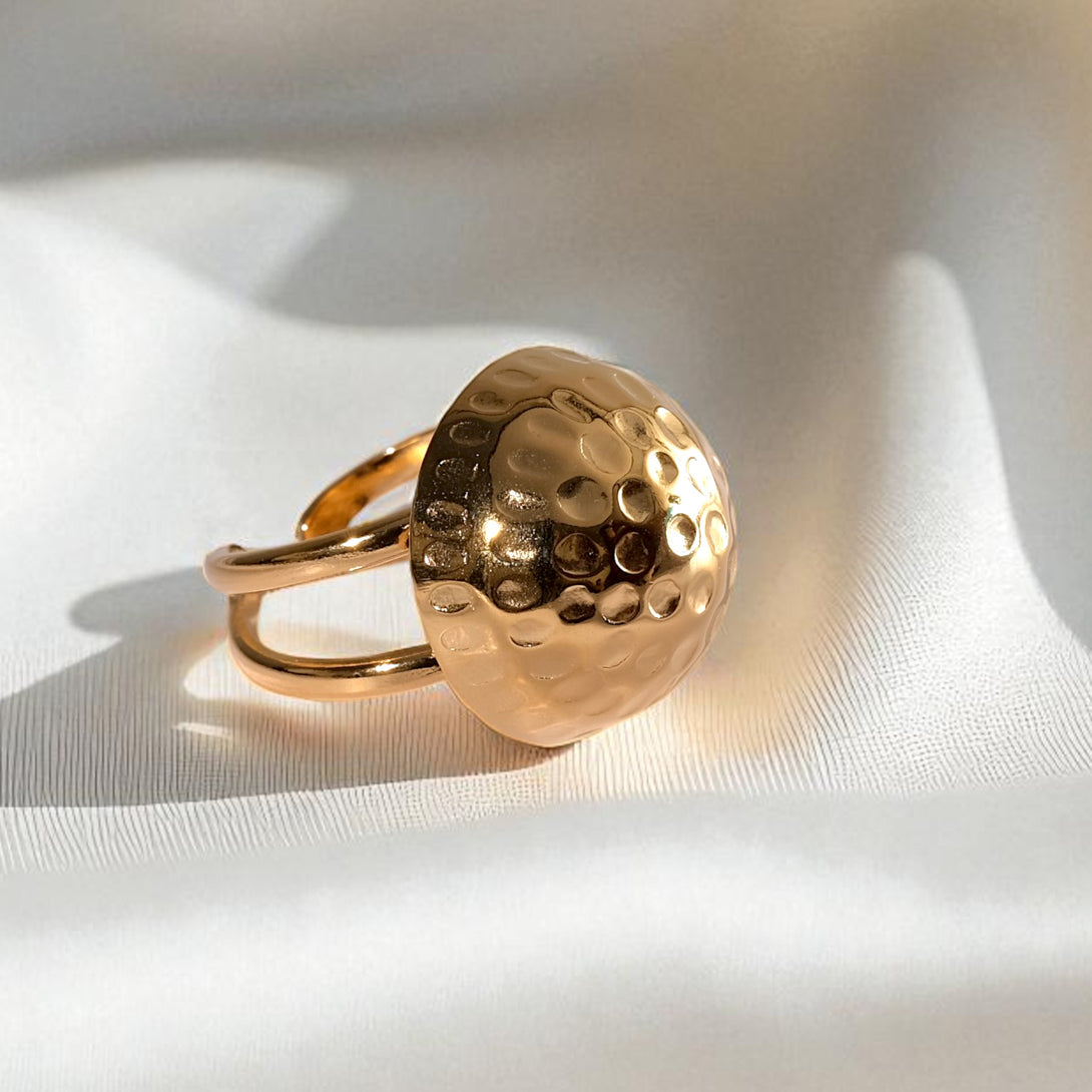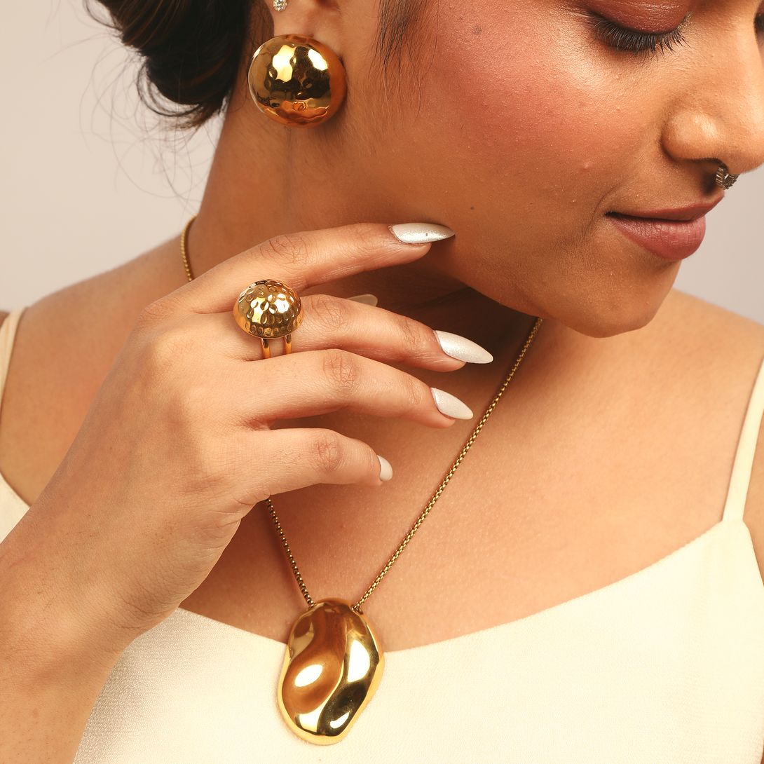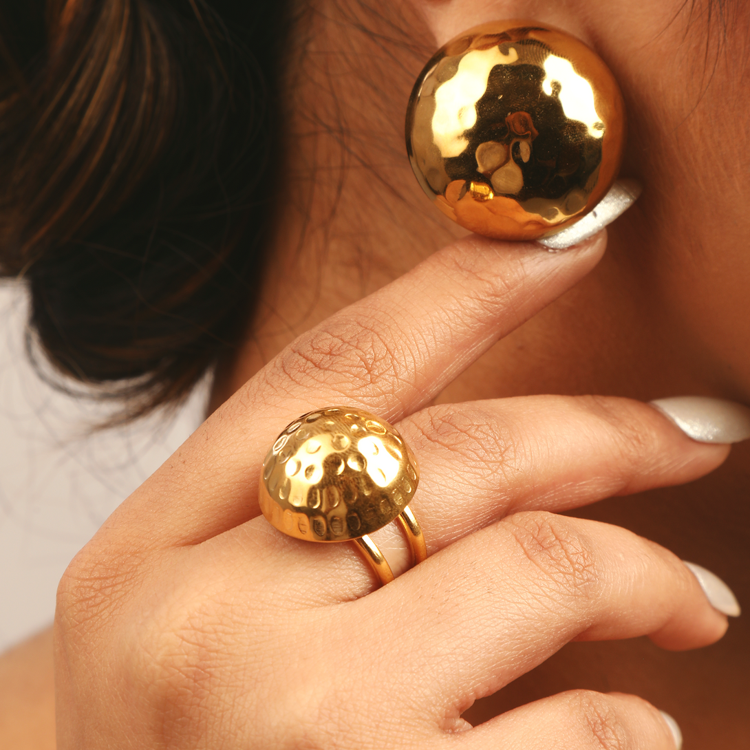 A bold, sculptural statement for the modern hand. This chunky sphere ring is built to be lived in. Its waterproof, hypoallergenic 18K PVD plating makes it a skin-safe piece that withstands endless hand washing and daily wear.