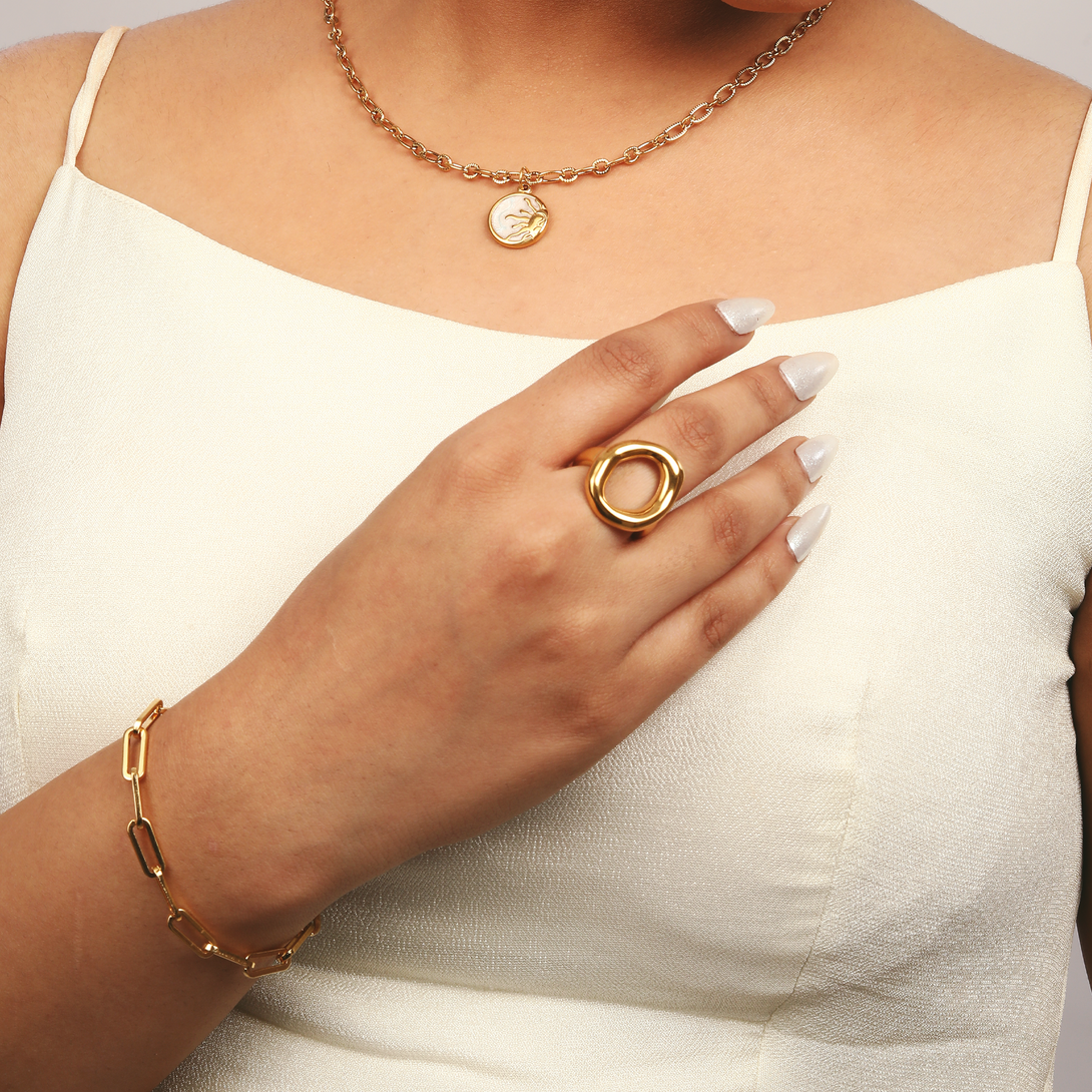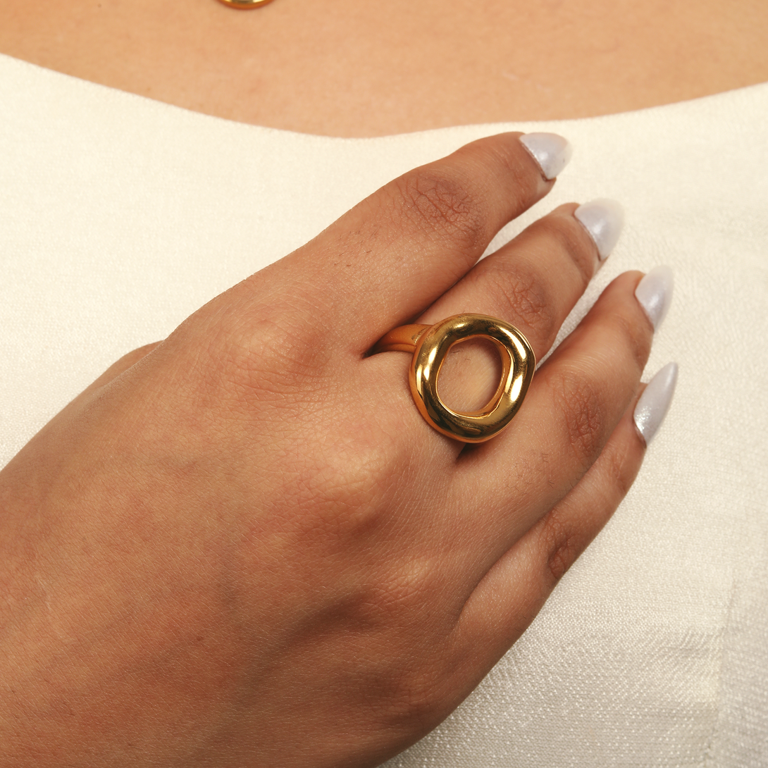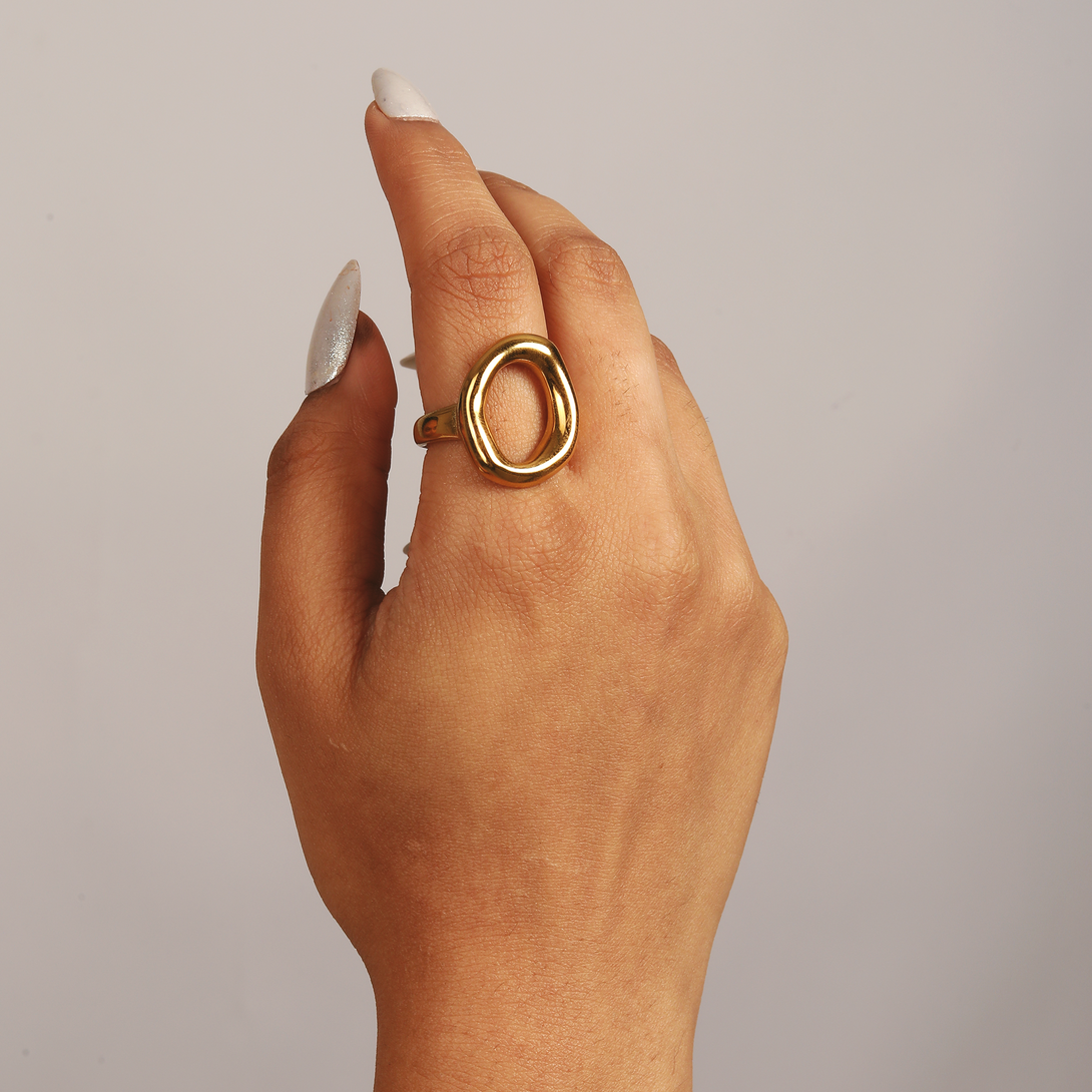 An edgy, modern statement in an irregular, hollow form. This adjustable ring is as durable as it is stylish. The skin-safe, 18K PVD plating makes it fully waterproof and hypoallergenic, perfect for everyday wear without fear of tarnish.